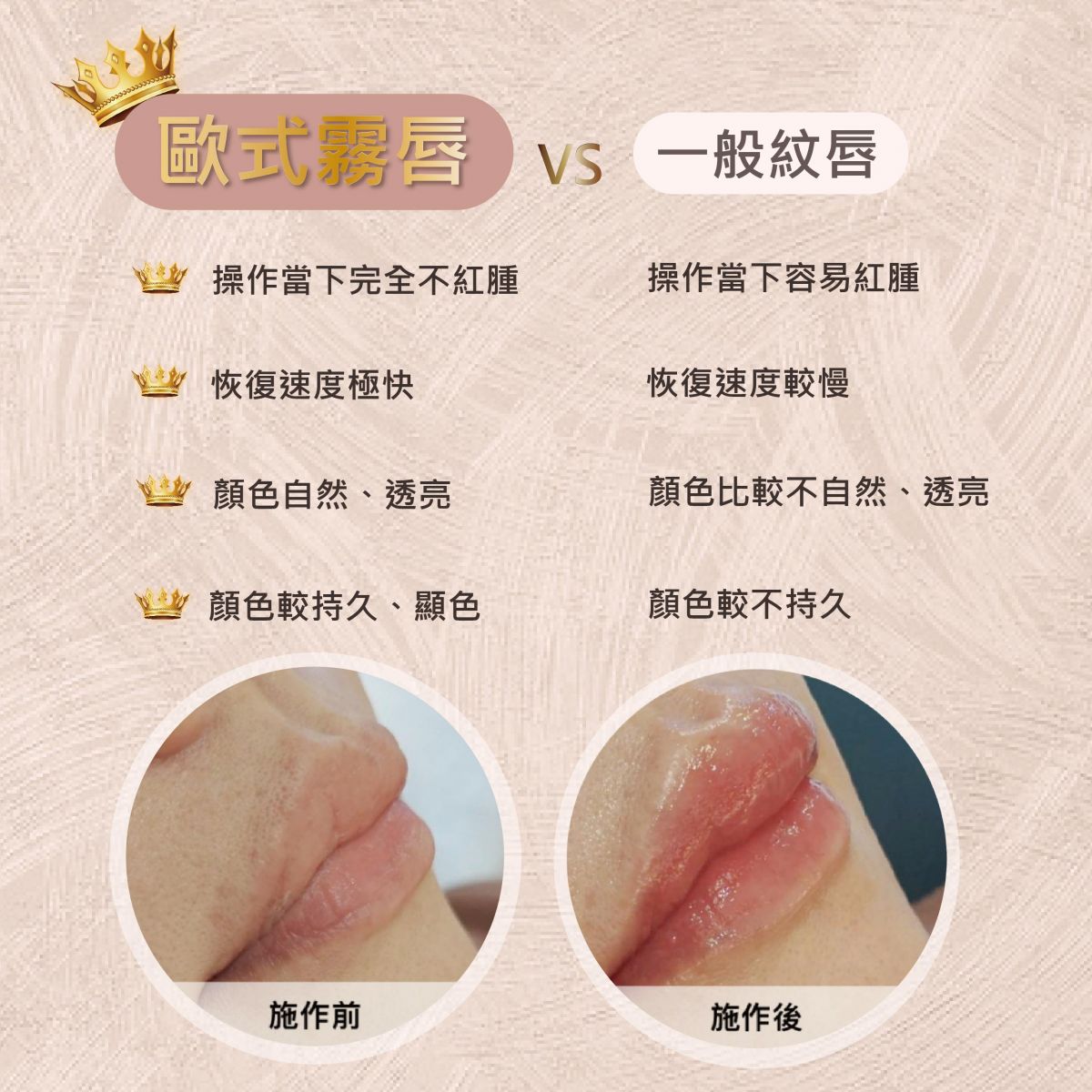 歐式霧唇使用的是歐洲進口品牌的植物性色乳,不含重金屬致癌物,不會有殘留的擔心,不會在後期使唇色變色、反黑,有更佳的持色度且顏色自然,使用歐式手法,跟過去常見的繡唇不太一樣,歐式霧唇使用極細小微創針,而傳統繡唇則是使用片面排針。歐式霧唇美容療程時間短,無痛、均勻自然。
