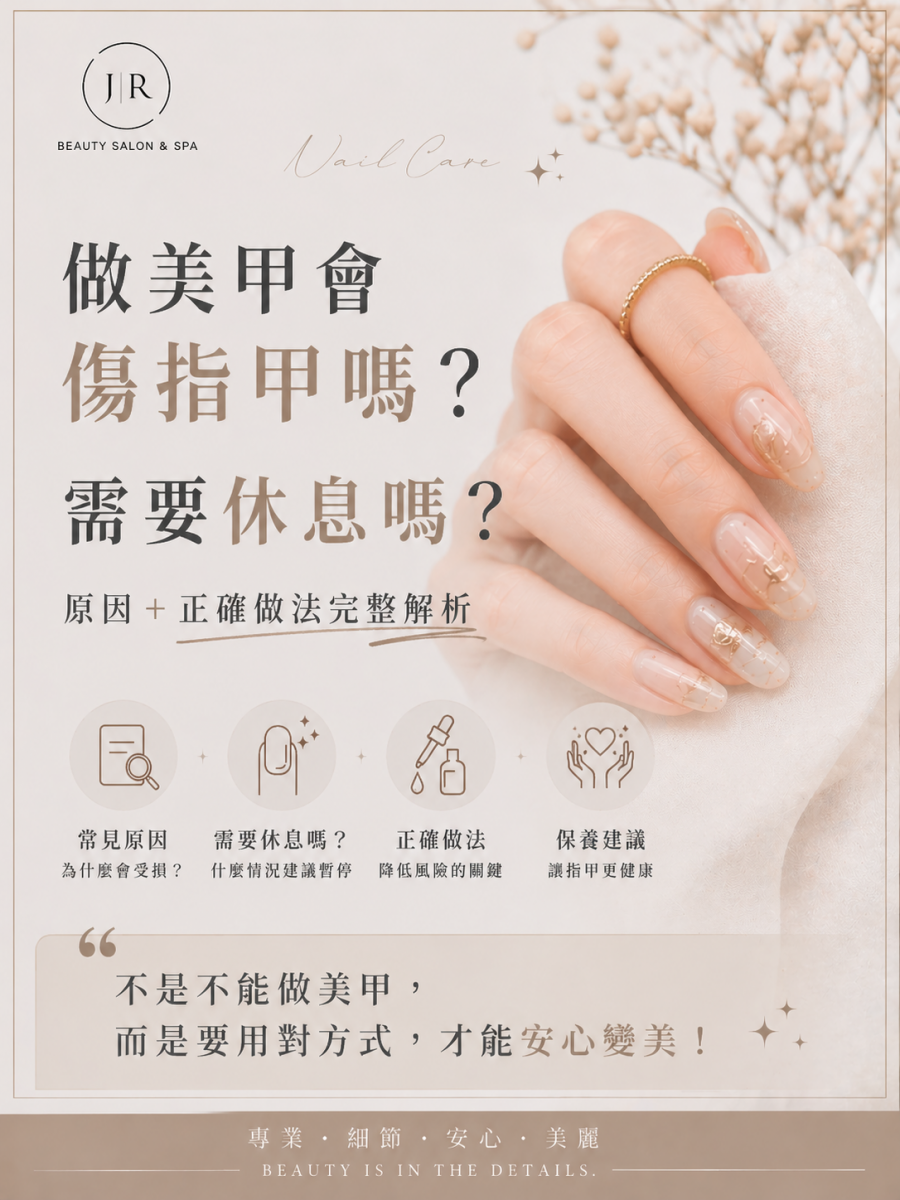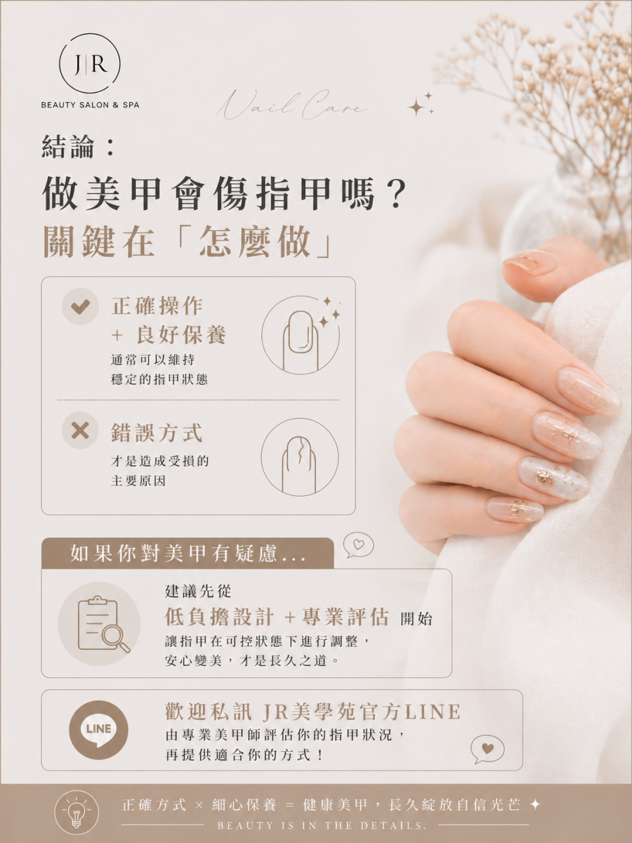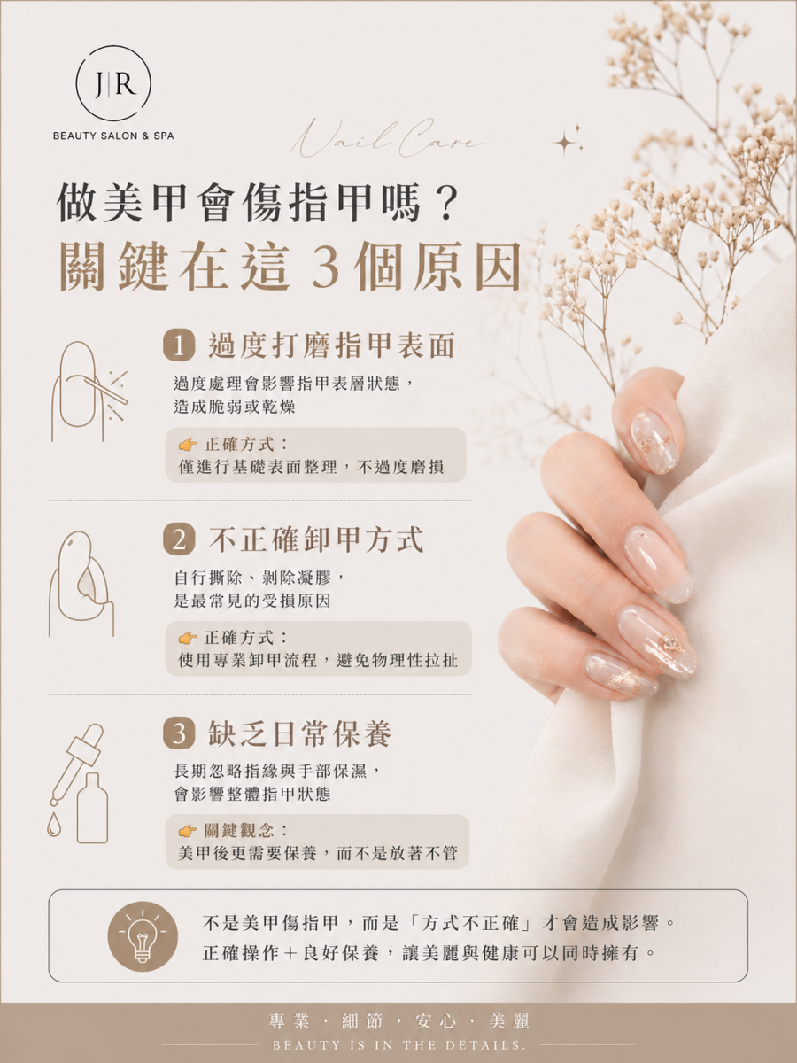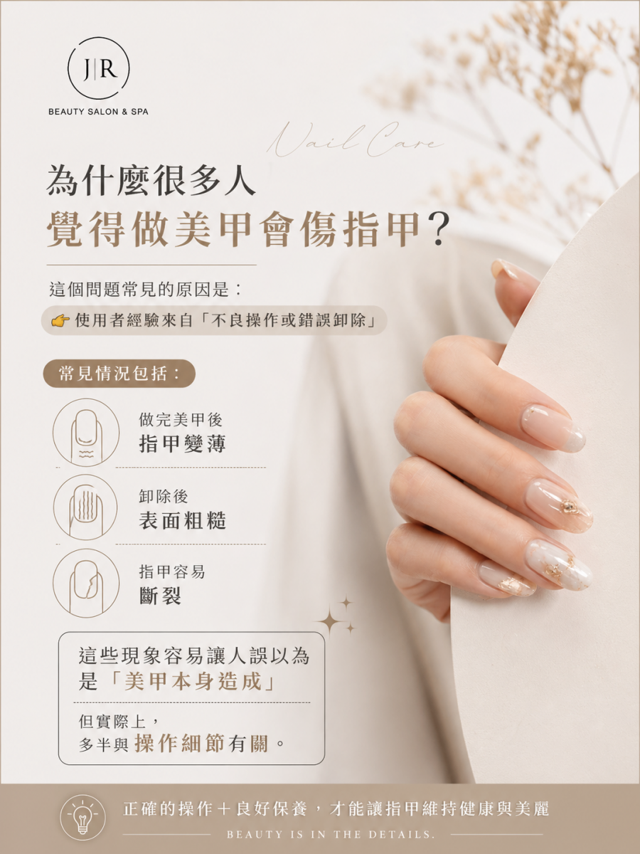 - 做美甲本身不一定會傷指甲,關鍵在操作方式與卸甲方式