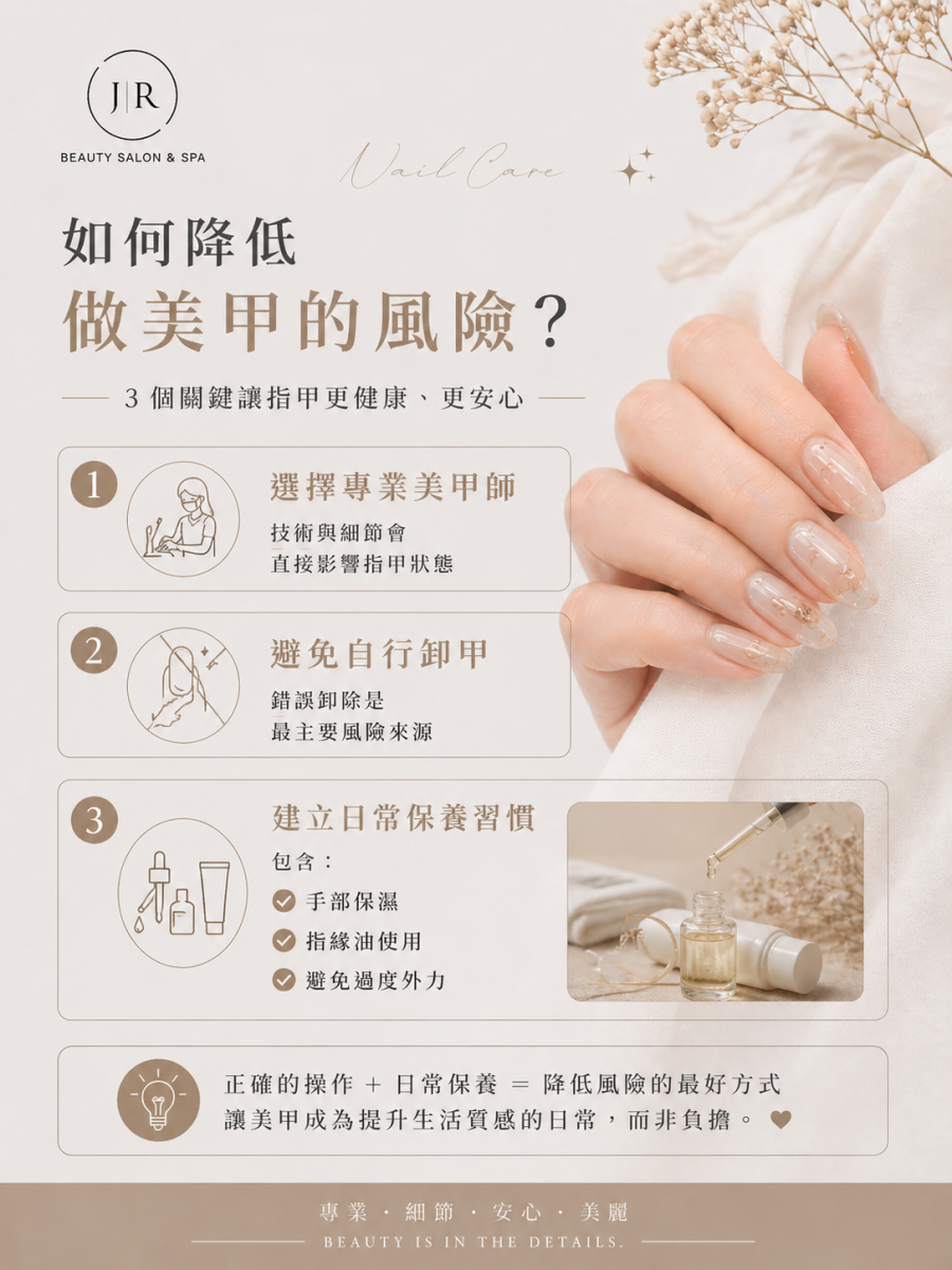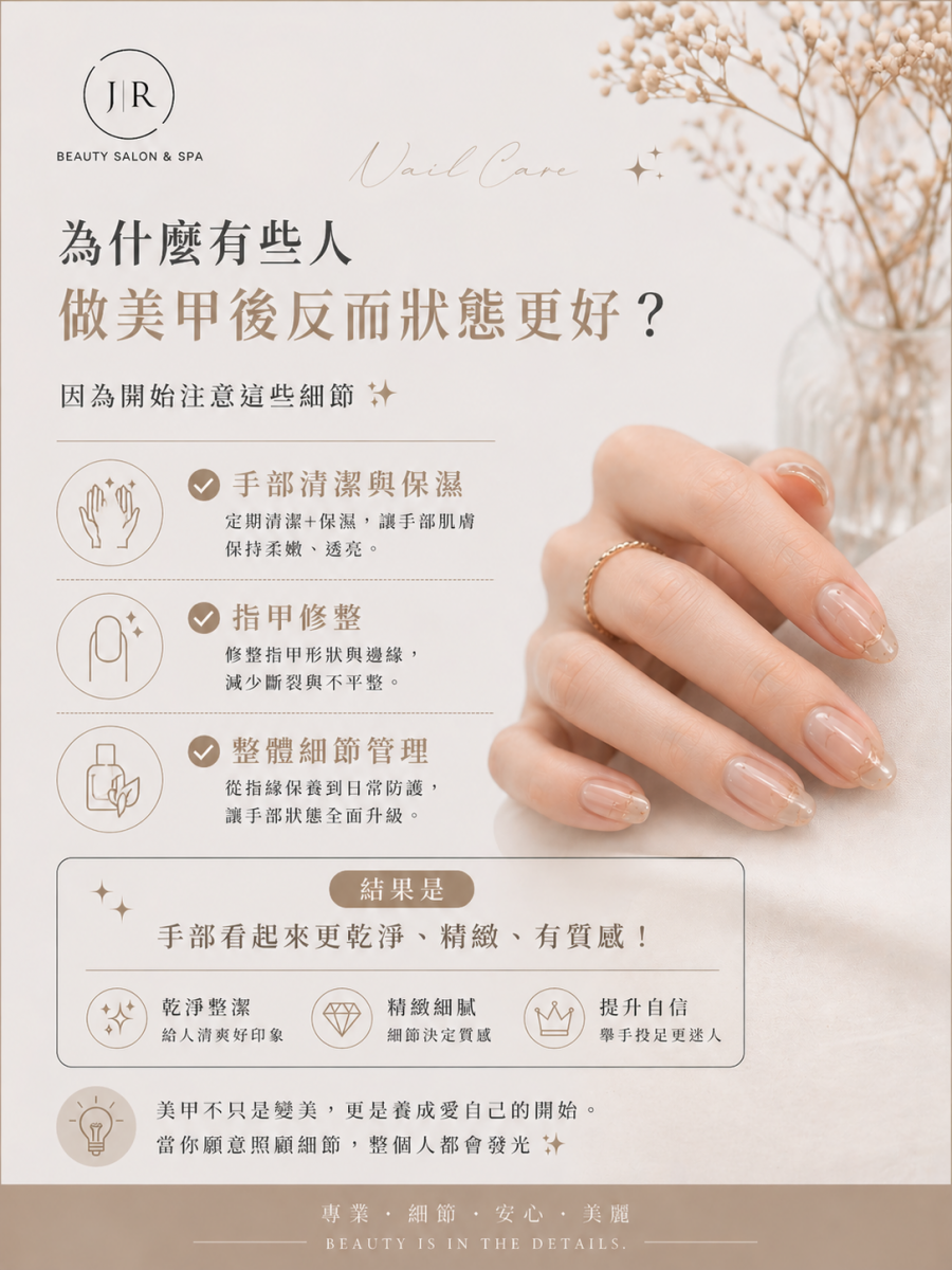 - 正確保養與專業施作,可維持良好指甲狀態