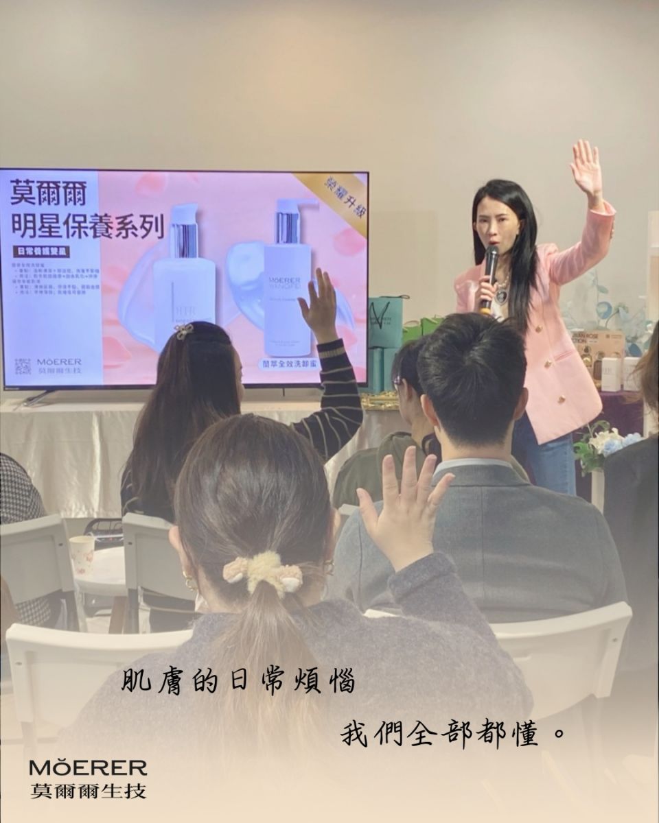 舉手互動,是整場最閃亮的橋段。有人問底妝易卡紋;有人說值班到深夜、臉容易乾;也有人想把「一次客→回流客」做成流程。